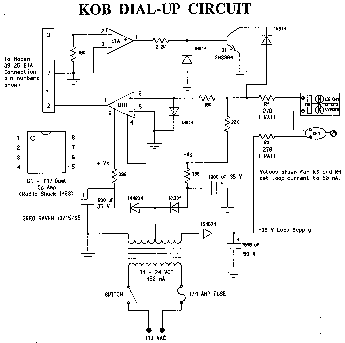 Think landline telegraphy using genuine American Morse is gone forever ? Well, think again ! A small group of dedicated enthusiasts practice the art of landline Morse telegraphy on a weekly basis using a method called "dial-up telegraphy". Obsolete 300 baud modems are interfaced to a key and sounder with a simple circuit. The full-duplex mode of these modems allows a "DC loop" to be exactly simulated.