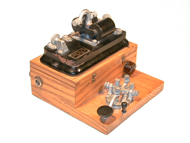 One of the very last of the portable sets was used by Western Union to cover special events. This set is very unique in that it does not use a conventional sounder. Instead, a telephone headset is used to produce the clicking sounds of the Morse code. This was done in the case where a reporting telegrapher would be in close proximity to a speaker, or any situation where a conventional sounder would be a nuisance. An excellent example of this is covered in "The Era of Morse Telegraphy" by Arthur Grumbine. Arthur covered a speech by President Roosevelt. Art's photo clearly shows several of the special events sets in use.