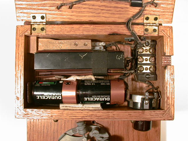 The line circuit is a very typical mainline relay type 4-C. This is in series with the 2-A steel lever telegraph key. Rather than using a noisy local sounder, a telephone headset powered by 2 D cells works as the telegraph receiver. Using a variable resistor in series with the headset provides a basic volume control. A capacitor across the relay contacts prevents arcing and oxidation of the contacts. Here's a close up of the interior of the set: