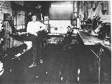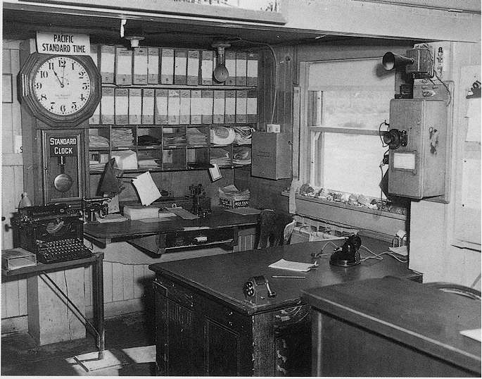 Agent's office on the Southern Pacific narrow gauge railroad at Owenyo California in 1954. On the operator's desk can be seen a rare Vibroplex Upright semi-automatic key. This is perhaps the only photo of one of these rare keys in its indigenous environment. |