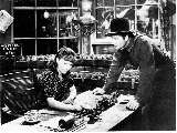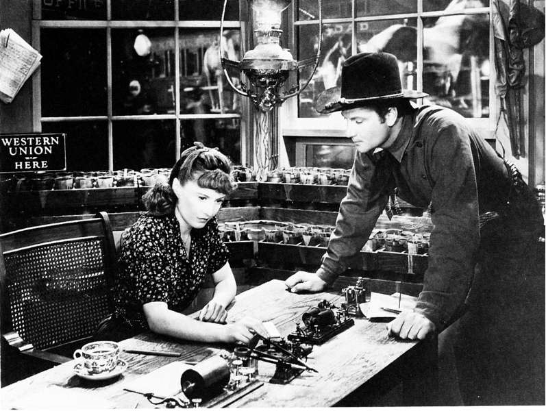 Telegraph office from the movie "Union Pacific". Note locomotive headlight in the background. Also note mainline battery on the table behind the operator. |