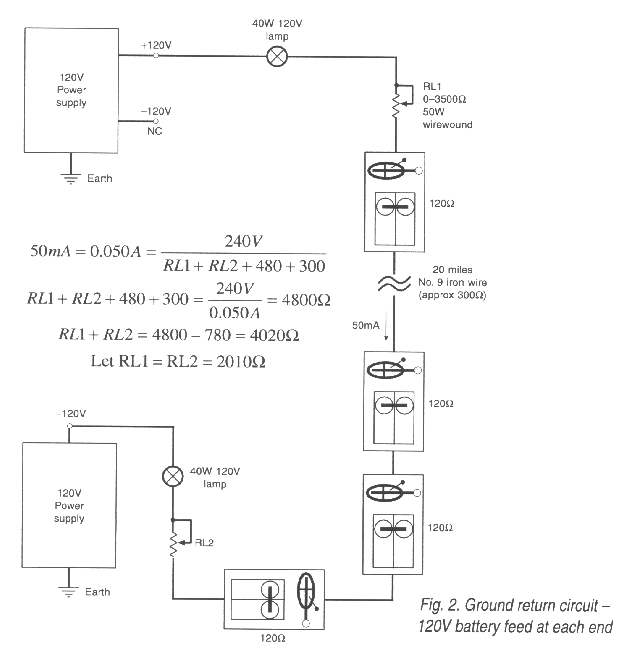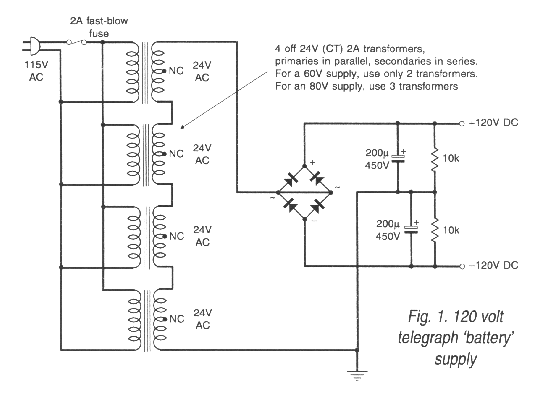 1. For reasons explained in a previous article (‘Observations on Telegraph Instrument Use in Circuit’) adequate voltage must be supplied in order for the instruments to operate properly, particularly if high resistance 100, 120 or 150 ohm mainline instruments are to be used. The 'open circuit' voltage is the supply voltage such as would be measured in the circuit across an open key with a DC voltmeter. For circuits with more than two mainline instruments in circuit, this voltage should be not less an 100 volts in order to obtain proper operation and ease of adjustment of the sounders or relays. Lower voltages can used but performance will suffer if too many instruments are cut into a circuit with insufficient supply voltage, regardless of the operating current value.