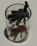The gravity battery is actually a form of electrochemical cell used to provide a source of electrical power for the telegraph. By the early 20th century, most telegraph lines were powered by motor-generators, however, the gravity battery continued to be used in way stations to power the local circuit. This practice continued at least into the 1950s. The gravity battery used a zinc and a copper electrode. The zinc electrode is seen hanging from the top of the jar. It is often called a "crow's foot" due to its design. A copper electrode is positioned at the bottom of the jar, and is connected to the circuit with an insulated wire. The term "gravity" is used since the solutions of copper sulphate and zinc sulfate have different densities and seperate like a mixture of oil and water. Solid copper sulfate or "bluestone" is added to the copper electrode at the bottom of the cell. The copper sulfate is slowly depleted in use. More copper sulfate is added to refresh the cell.