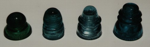 While not a tool per se, the development of the glass insulator was critical to the telegraph's success. The original Morse telegraph line constructed from Baltimore to Washington DC used a buried conductor. When it was found that the line suffered from excessive leakage due to faults in the insulation, it was decided to string the wire overhead using wooden poles. The wire was insulated from the pole by sandwiching it between glass plates. Next a glass doorknob was used. The doorknob was mounted on a wood pin, and the telegraph wire was then attached to the doorknob using a small piece of wire. The modern insulator evolved from this arrangement. It was found that even with the wire touching only the glass, excessive leakage or "escapes" were still a problem. This leakage limited the usable length of the line or even prevented its use in wet weather. Improvements in the design of glass insulators reduced the leakage problem significantly, but they never entirely eliminated it. The most important innovation was the "petticoat" design. The petticoat works as a sort of umbrella, and it keeps a dry path from the wire to ground even when the insulator is rained on. Another innovation was the threaded insulator design. Previous to this, insulators were simply pushed onto a wooden spike. Wind combined with the tension of the wire caused the insulator to pop loose from the wooden spike. The addition of the thread prevented the insulator from popping loose, thus greatly improving the reliability of the telegraph line. The insulators shown from left to right are: A.T.&T. Co., Unknown beehive design (probably Canadian), McLaughlin #19, Hemingray #42.