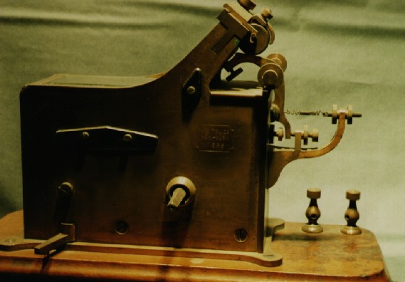 The "register" was the original Morse receiving device. An electromagnet attracts an armature which causes a stylus to emboss a mark in a paper tape. A weight or spring driven mechanism was used to feed the paper tape through the register. The markings on the tape were then interpreted by an operator. The register continued in general use for only a few years. It was soon discovered that operators could simply right down the message by listening to the clicks of the register. This was called "sound reading". It was actually forbidden by some early telegraph companies, as it was believed to be a haphazard way of receiving Morse. Eventually it was proven to be entirely adequate with regards to accuracy. Sound reading was also found to more cost-effective due to the fact that only one operator was required. The register attendant could be fired ! This register was made by G.M. Phelps for the Western Union Telegraph Company. It has a large clock-spring mechanism and a liquid damper to control the speed of the paper feed.